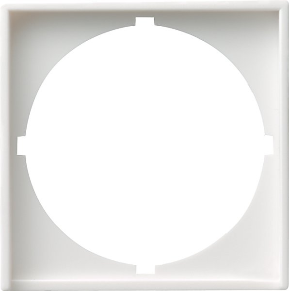 Zwischenplatte mit rundemAusschnitt für Geräte mit Abdeckung (50 x 50 mm) System 55 Reinweiß glänzend Mit dieser Zwischenplatte und Abdeckrahmen (1 bis 5fach) lassen sich Fremdgeräte mit quadratischen Zentralplatten in das Schalterprogramm integrieren.