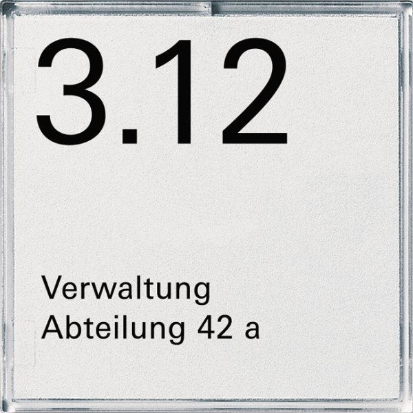 Namensschild Türschild 1fach System 55 Reinweiß Namensschild Türschild für Zimmer. Es besteht aus einer Grundplatte und einer transparenten, steckbaren Abdeckung. Zwei Befestigungsmöglichkeiten stehen zur Auswahl:Anschrauben:Die Grundplatte des Namensschildes Türschildes wird mit den mitgelieferten Schrauben Dübeln an der Wand befestigt.Ankleben:Auf glatten Oberflächen, z.B. lackierte Wände, wird die Grundplatte mit den beiliegenden Klebepunkten befestigt.Der 51 x 51 mm große Schriftträger lässt sich problemlos auswechseln. Die transparente Abdeckung abziehen und die Einlage austauschen. Die Beschriftungsbögen können auf allen gängigen Druckern ausgegeben werden.
